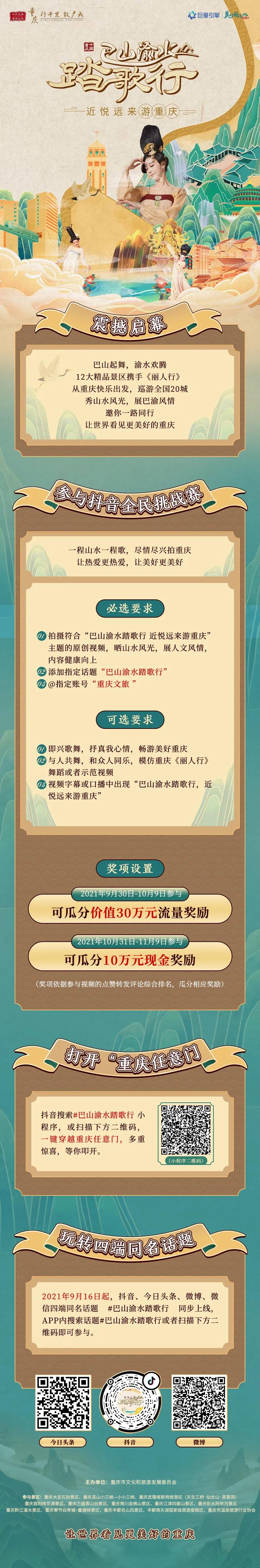 摘要: 《巴山渝水踏歌行》2021重慶文旅全國巡回推介活動華麗啟幕,你將有機會看到山水重慶實景版《麗人行》,當麗人走進世界的武隆,邀你探訪隱士人家。