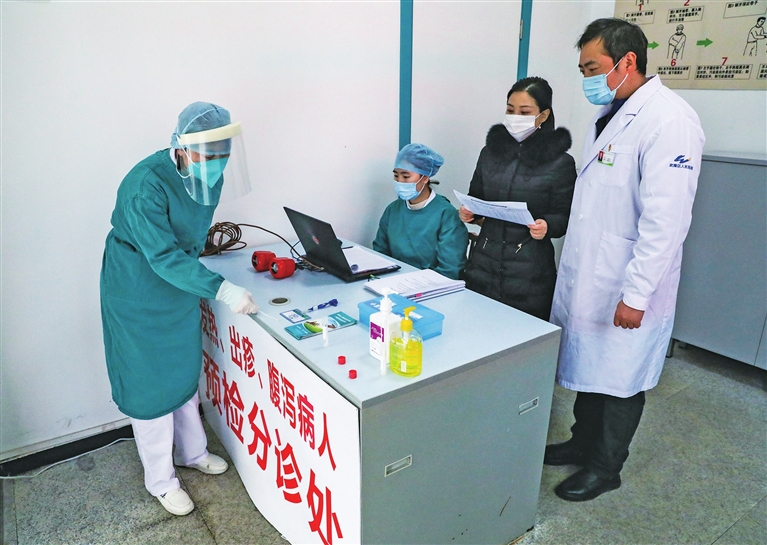 圖為區(qū)人民醫(yī)院紀(jì)委干部現(xiàn)場(chǎng)督查預(yù)檢分診處消殺及登記情況。(特約通訊員 黃銳/攝)