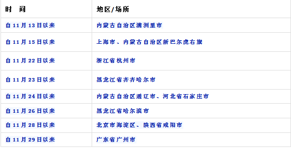 截止12月5日22時全國共有高風險地區(qū)8個,其中內蒙古呼倫貝爾市7個,云南德宏自治州1個。中風險地區(qū)33個,其中內蒙古通遼市1個、呼倫貝爾市4個,黑龍江哈爾濱市22個,上海市浦東新區(qū)3個、青浦區(qū)1個,廣東省廣州市1個,云南德宏自治州1個。