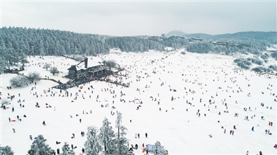 圖為游客在仙女山大草原盡情賞雪玩雪。
