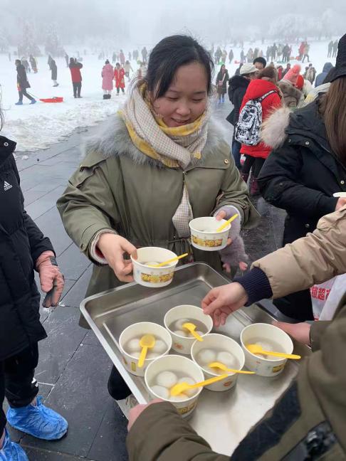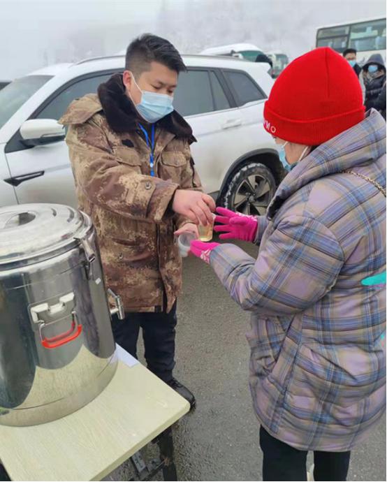 景區(qū)工作人員為游客送上暖心姜湯