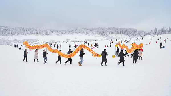 上午9點(diǎn)20分,在仙女山景區(qū),一場極具中國傳統(tǒng)“年味”的舞龍表演,吸引眾多游客駐足觀看。舞龍隊(duì)員們狂舞著一條金黃色長龍,時(shí)而上下盤旋,時(shí)而搖頭擺尾,龍躍雪原,場面相當(dāng)震撼。在熱鬧的氛圍中,不少游客躍躍欲試。來自彭水的劉先生表示,這場舞龍表演,很精彩,讓人看得很過癮,可見,武隆景區(qū)在這方面的工作做足了準(zhǔn)備,狠下了功夫。