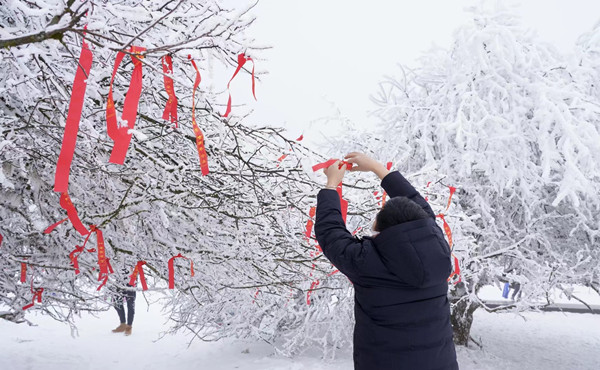 上午10點(diǎn),小編在仙女山看到很多游客站在銀花樹下,閉緊雙眼,虔誠地緊握雙手,默默地許著新年愿望,讓我不忍心上前,生怕驚擾了他們。愿望是我們每個(gè)人都有的,它蘊(yùn)含著人生的祈求與精神寄托。站在銀花樹下許心愿,動手掛上心愿卡,你的愿望就有機(jī)會實(shí)現(xiàn),不信你來試試看。