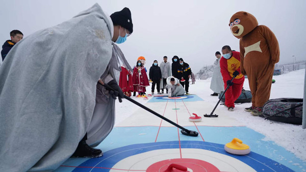 中午12點(diǎn),小編在仙女山滑雪場看到冰壺項(xiàng)目吸引了不少游客的目光。雖然沒有高配的場地,但是在地面的墊子上同樣可以將冰壺玩得不亦樂乎, 隨手一擲高水平發(fā)揮,冰壺劃出一道美妙弧線,穩(wěn)穩(wěn)旋進(jìn)中心。據(jù)景區(qū)工作人員介紹,春節(jié)期間,武隆景區(qū)圍繞“迎冬奧到武隆”為主題開展了一系列趣味冰雪運(yùn)動,除冰壺外,還包括冰球、雪橇、雪車等,現(xiàn)場游客均可參與其中,體驗(yàn)競技運(yùn)動帶來的無限快樂。