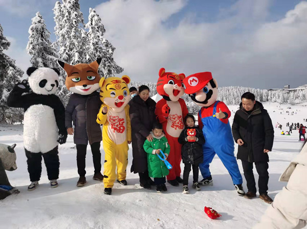 當(dāng)日,NPC卡通玩偶與游客親密互動,小老虎、光頭強(qiáng)、財(cái)神爺、呆萌兔等角色玩偶,帶領(lǐng)游客在仙女山大草原開啟了一場別開生面的冰雪舞會,讓游客真切感受冰雪奇緣的濃厚氛圍。來自合川的陳女士一家表示,冰雪舞會活動極具新意、趣味十足,增添了不少互動樂趣。