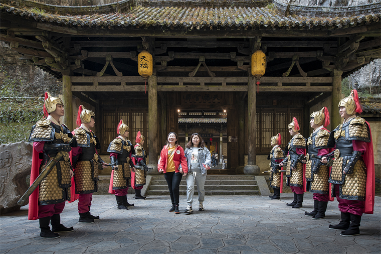“女王駕到”“恭迎女王陛下”“諸位請(qǐng)起,游玩到此,觀景甚美,諸位與我,共享此景。”在天生三橋景區(qū)天福官驛客棧,一群身形魁梧的帶刀侍衛(wèi),整齊地站在驛站門口兩側(cè)恭迎每位入園的“女王”?,F(xiàn)場(chǎng)儀式感爆棚,一身金黃的“女王”霸氣外露。驛站內(nèi)熱鬧的氛圍吸引了眾多游客參與,有的上前與侍衛(wèi)互動(dòng)拍照,有的主動(dòng)穿上“女王”服體驗(yàn)霸氣女王范,有的還主動(dòng)表演起了電影里女王翻牌的有趣橋段。“今天我最大,這樣過(guò)節(jié)著實(shí)過(guò)癮”玩得正起勁的劉女士表示,這是她過(guò)得最好玩、最具儀式感的女王節(jié)。