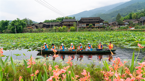 “接天蓮葉無窮碧,映日荷花別樣紅”,在荷花湖畔,放眼望去,200余畝的荷花開得正艷,在萬綠叢中綻露笑顏,呈現(xiàn)出一種自然天成、出淤泥而不染的冰清玉潔。一陣微風吹過,感受微風拂過臉頰,空氣中充滿荷花的香味,讓人心曠神怡。“Very beautiful!!!”外國友人連聲稱贊,一下車,便分成4個小組開始了荷花湖劃船比賽的比拼。