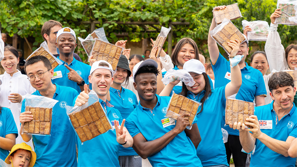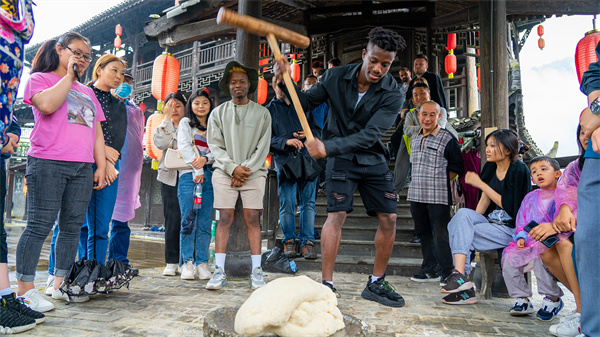 外國友人認真聽著講解員講解古法豆干的制作流程,并走進豆干作坊,饒有興致的參與推石磨、濾豆?jié){和鹵豆干等環(huán)節(jié)。“真香!”吃著才烤制出的豆干,外國友人品味著自己的勞動成果。