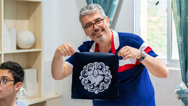 在聆聽老師的講解后,外國友人在染布上畫出自己喜歡的圖案,還特別署上自己的中文名字。在老師的指導下,通過上蠟,再染上天然植物提取的藍靛,精美的圖案就呈現(xiàn)出來了,老外們看著自己辛勤換來的成果,感到成就滿滿,對這種“藍底白畫”的風格贊不絕口。