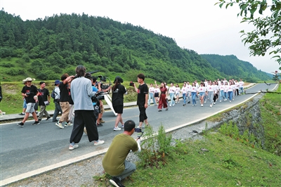 拍攝期間攝制團(tuán)隊(duì)將先后前往仙女山景區(qū)、天生三橋、龍水峽地縫、印象武隆劇場、大田濕地人家等地,從專業(yè)的角度選取能夠反映武隆旅游形象的素材。記者發(fā)現(xiàn),在拍攝取景中,攝制團(tuán)隊(duì)選取了《上武隆》歌詞仙女山、白馬山、天生三橋、芙蓉洞、天坑地縫等武隆特色旅游資源,團(tuán)隊(duì)采風(fēng)過程中所體驗(yàn)到的武隆絕美風(fēng)景,精妙詮釋了歌詞“今生今世為你來,上風(fēng)上水上武隆”的涵義。