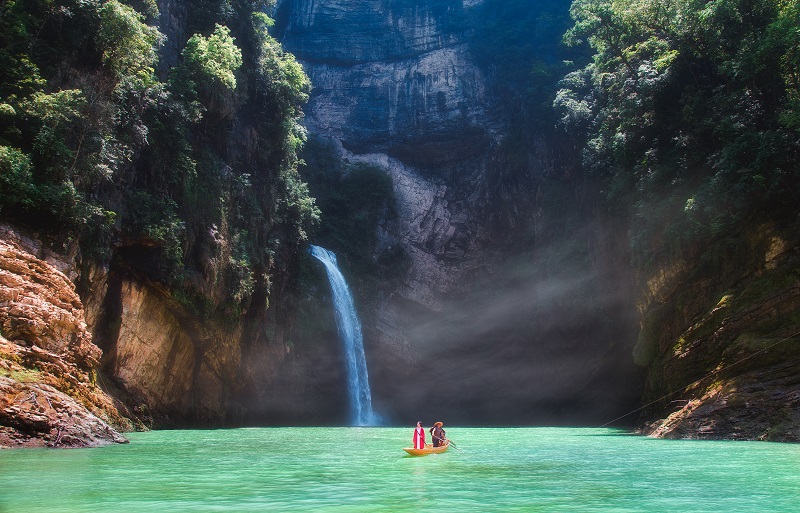 山青、水秀、崖雄、峰奇、峽幽、澗深……被譽(yù)為“水上喀斯特森林”的芙蓉江,原始植被密植兩岸,泉水瀑布高掛飛流,兩岸景色秀麗,真可謂是“貌似漓江,勝似三峽”。清代詩(shī)人翁若梅曾發(fā)出這樣的贊嘆:“閨藏深山人未識(shí),一朝聞名天下驚。水送山迎入芙蓉,一川游興畫圖中。”