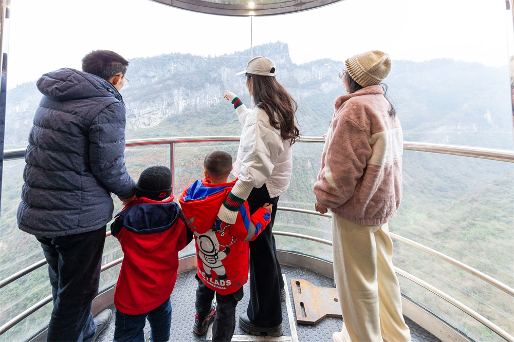 除了賞雪耍雪、看煙花,武隆天坑地縫美景對游客們也“列隊(duì)歡迎”。大年初三,國家5A級景區(qū)、世界自然遺產(chǎn)地,武隆天生三橋景區(qū)張燈結(jié)彩、年味十足。作為亞洲首部景區(qū)360度旋轉(zhuǎn)電梯,“天龍旋梯”可謂是亮點(diǎn)十足,游客紛紛前往景區(qū)打卡,站在電梯內(nèi)觀賞奇特的喀斯特風(fēng)光。
