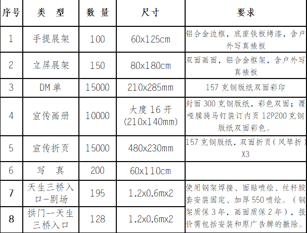 重慶市武隆區(qū)喀斯特印象文化發(fā)展股份有限公司需制作一批宣傳物料和更換燈桿廣告,現(xiàn)面向社會誠邀各供應(yīng)商參加比選,現(xiàn)將有關(guān)事項函告如下: