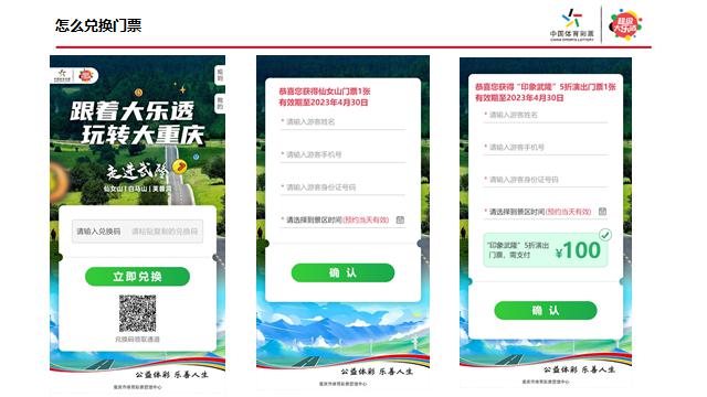 此外,活動期間游客購買武隆景區(qū)任意電子門票,即可獲得體彩大樂透彩票兌換券(以短信方式發(fā)至預約手機),在重慶任意體育彩票實體店可兌換大樂透彩票,就有機會獲取千萬大獎。值得注意的是入景區(qū)時間以預約為準(但不晚于4月30日)。