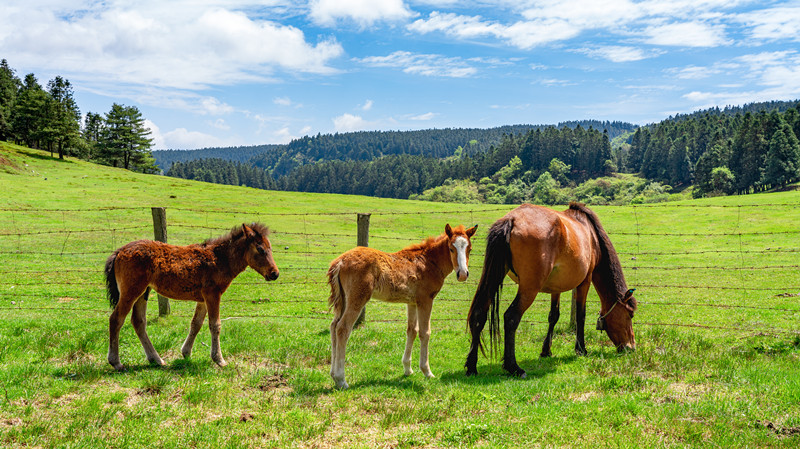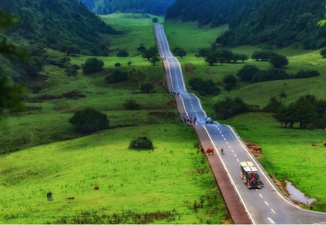 行走在仙女山最美公路上,高低起伏的公路向遠(yuǎn)方延綿,最后消失在盡頭。道路兩旁則是綠草茵茵,與悠閑行走、吃草的牛馬共同形成一幅愜意溫馨的畫面。