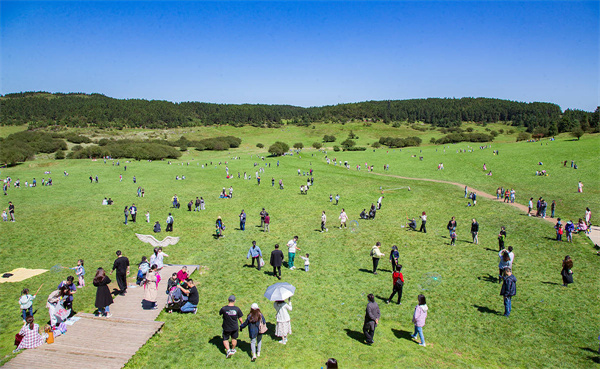 從天生三橋出來游客們意猶未盡,馬不停蹄來到了仙女山。正值春盛的仙女山茫茫林海,蒼翠欲滴。山林間的遼闊草場延綿天際,旖旎風(fēng)光給人呼倫貝爾大草原的即視感。