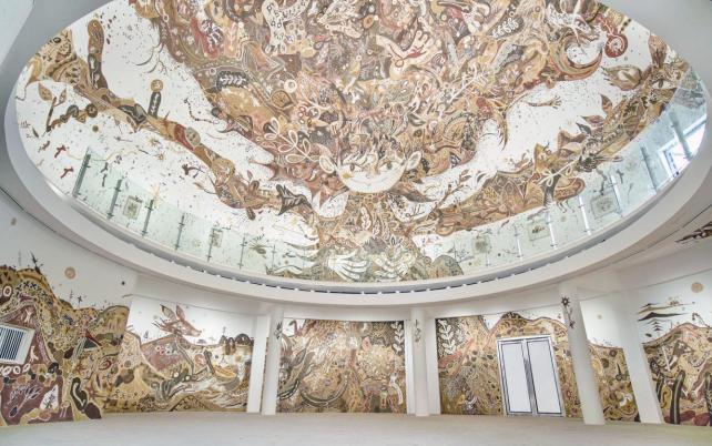 大地輕盈如畫,沒有邊際。在苔蘚館區(qū),你必須屏住呼吸,將腳步放得不能再輕,一幅名為《大地從天而降》的巨型壁畫,讓我看到了隱居在生命中的色彩和瘋狂。藝術(shù)家淺井裕介用其中一座苔蘚館的穹頂和整面圓形墻壁構(gòu)圖,以19種本地泥土為顏料,創(chuàng)作了這幅壁畫,畫面奇幻夸張,極具視覺沖擊力。