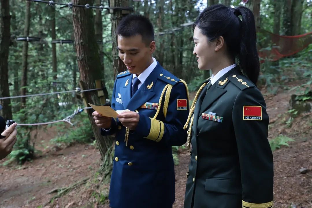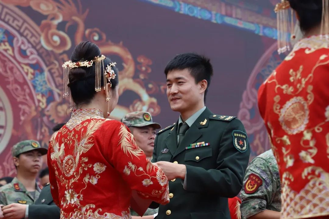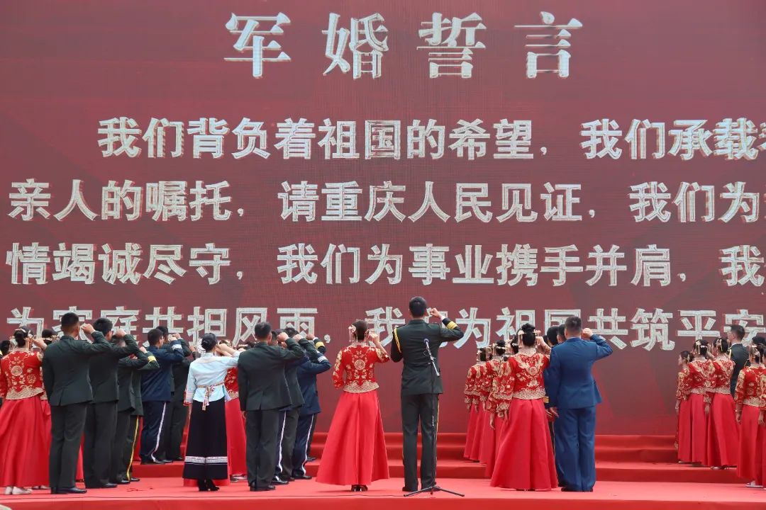 活動(dòng)中,來(lái)自西部邊防和駐渝部隊(duì)各兵種、各崗位的100名官兵們身著禮服,牽著伴侶的手,幸福地步入婚禮現(xiàn)場(chǎng)?;ベ?zèng)禮物,新郎新娘互飲交杯酒,傾聽(tīng)神圣的軍婚誓言。