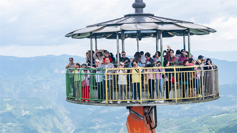 旅行團(tuán)一到武隆,首先就來到了白馬山天尺情緣景區(qū)。以白馬山和仙女山的愛情文化為主題,白馬山天尺情緣景區(qū)是一處集休閑、娛樂、親子、觀光、度假于一體的生態(tài)旅游景區(qū)。特別是網(wǎng)紅景點(diǎn)“飛天之吻”,尤其受游客青睞,不少印尼游客慕名而來,爭先體驗(yàn)高空之上的浪漫與刺激。作為全球唯一的雙子互動(dòng)式飛行島,“飛天之吻”絕對是此次白馬山之行的重頭戲。它建于望仙崖的懸崖邊上,升起后底座距崖底烏江的垂直落差達(dá)1314米。