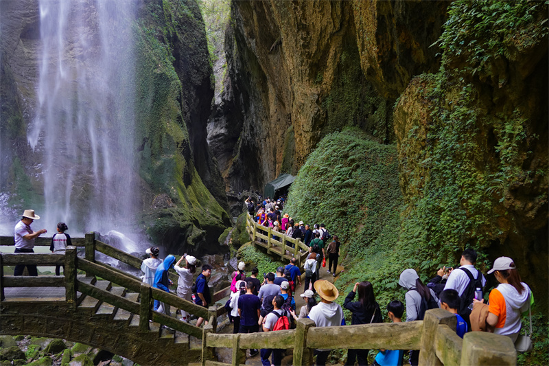 國慶期間,武隆各大景區(qū)都穿上了“中國紅”新裝,喜慶氛圍濃厚。在仙女山,游客們同與國旗合影,表達著對祖國的祝福;在天生三橋景區(qū),站在高大山體橋墩下,游客們被大自然得天獨厚的自然風(fēng)光深深吸引;受降雨影響,“地球最美裂痕”龍水峽地縫水量空前,呈現(xiàn)出“飛流直下三千尺,疑是銀河落九天”的超壯觀景致,令游客們驚嘆不已;作為世界唯一被列為世界自然遺產(chǎn)保護地的洞穴——芙蓉洞,每天都吸引著上萬游客來此觀光旅游……