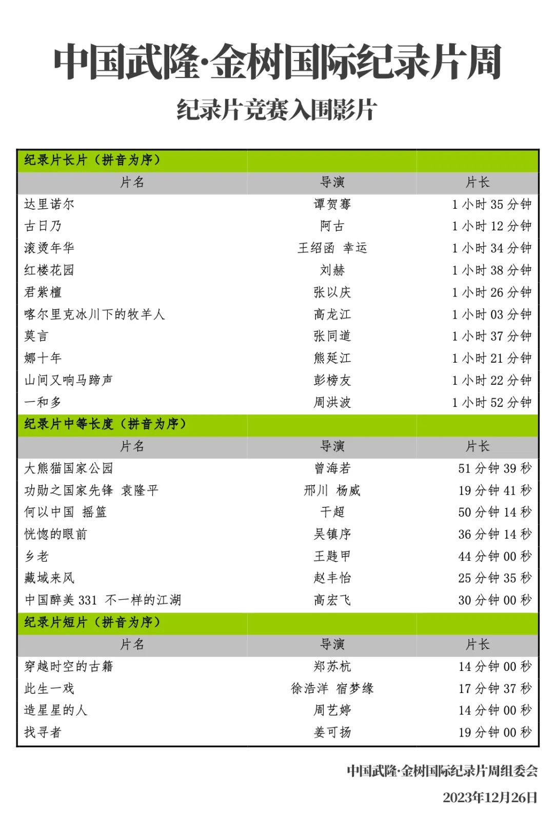 中國(guó)武隆·金樹(shù)國(guó)際紀(jì)錄片周自2023年10月1日開(kāi)始征片,得到了國(guó)內(nèi)紀(jì)錄片行業(yè)的廣泛關(guān)注和支持,12月10日截止報(bào)名,累計(jì)征集了3143部作品。經(jīng)過(guò)33位初評(píng)委和5位預(yù)評(píng)委的辛苦工作和認(rèn)真評(píng)審,最終有21部影片入圍,角逐7個(gè)獎(jiǎng)項(xiàng)。終評(píng)委團(tuán)隊(duì)由來(lái)自六個(gè)國(guó)家的7位紀(jì)錄片專家組成。