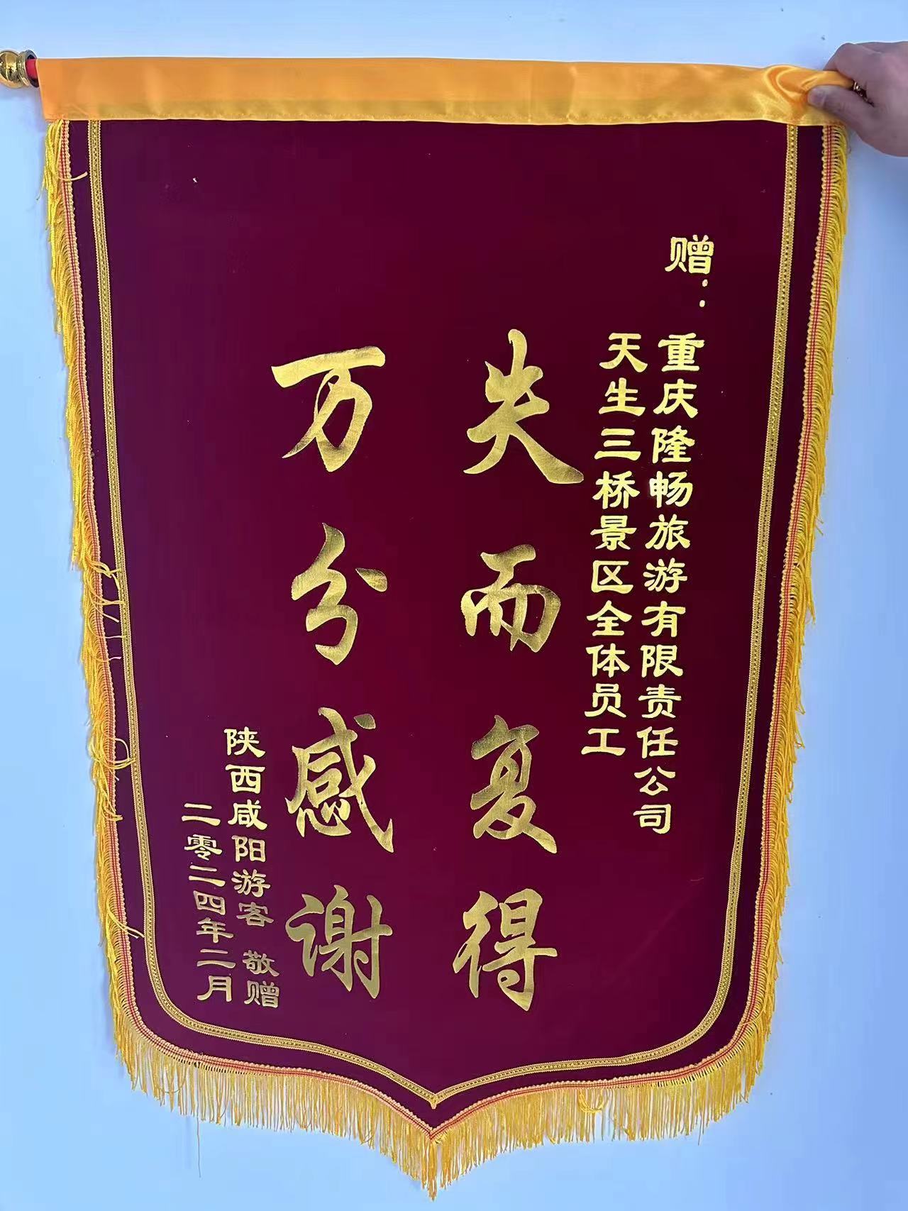 今年以來(lái),武隆景區(qū)多次發(fā)生類似員工拾金不昧,被游客稱贊的情況。近日,武隆天生三橋景區(qū)收到陜西籍游客王女士寄來(lái)的包裹,包裹里是一面繡有“失而復(fù)得、萬(wàn)分感謝”的錦旗,以此對(duì)天生三橋景區(qū)全體員工拾金不昧的行為表示誠(chéng)摯地感謝。
