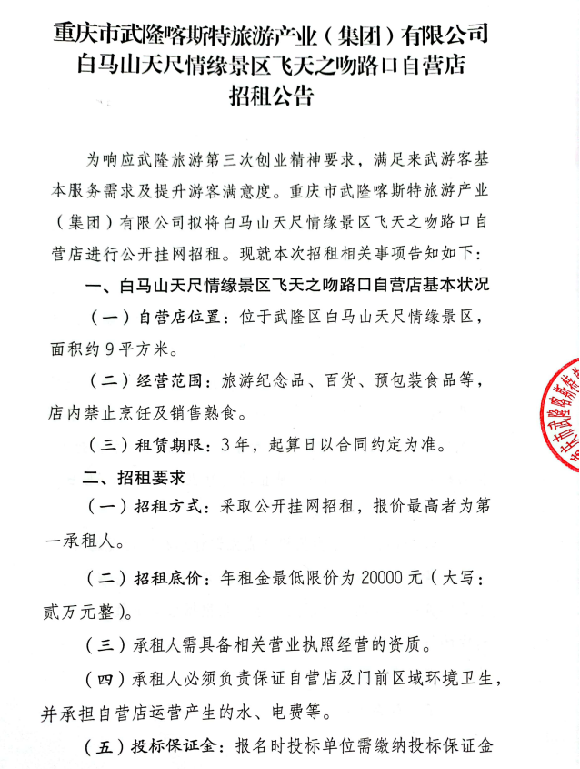 重慶市武隆喀斯特旅游產(chǎn)業(yè)(集團)有限公司白馬山天尺情緣景區(qū)飛天之吻路口自營店招租公告