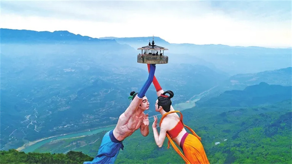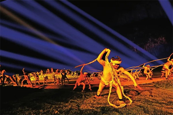 “印象武隆”實(shí)景演出?!队∠?middot;武隆》是由著名導(dǎo)演張藝謀出任藝術(shù)顧問,王潮歌、樊躍擔(dān)任總導(dǎo)演打造的大型山水實(shí)景演出。以瀕臨消失的國家級(jí)非遺“川江號(hào)子”為主要內(nèi)容,讓觀眾在70分鐘的演出中親身體驗(yàn)自然遺產(chǎn)地壯美的自然景觀和巴蜀大地獨(dú)特的風(fēng)土人情。2024 年3月被評(píng)為國家文化產(chǎn)業(yè)示范基地。