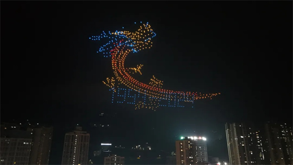 1000架閃爍著霓虹燈的無人機(jī)緩緩升空,按設(shè)定程序在空中快速編隊(duì)、懸停,不斷地變化陣型,組合成“龍”“芙蓉洞、芙蓉江”“仙女山觀光小火車”“天生三橋”“印象隆”“武隆城市剪影”“仙女山機(jī)場”“逐夢未來更精彩”等主題的字體和圖案,與炫彩奪目的城市夜景交相輝映,為市民和游客呈現(xiàn)了一場獨(dú)有的視覺盛宴。整場無人機(jī)表演持續(xù)了15分鐘,猶如一場精彩的空中電影。