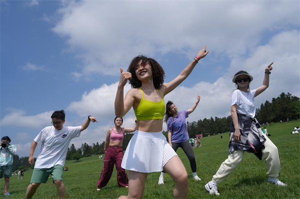踩著音樂的節(jié)奏,把身體交給律動,跟著老師的步伐和動作,打開自己。一起熱汗一起嗨,加倍分泌多巴胺。這本就是仙女山夏天該有的樣子。超燃的音樂配合熱情舞蹈,一下子就吸引了不少游客圍觀、加入,現(xiàn)場氛圍嗨到了極點。