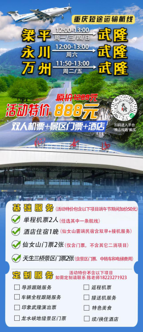 為慶祝短途運(yùn)輸航線的開通,華夏飛滴與武隆景區(qū)聯(lián)手推出了一系列誘人的優(yōu)惠活動(dòng)。旅客只需888元(端午期間加價(jià)50元)就能享受到雙人機(jī)票+景區(qū)門票+酒店的超值組合優(yōu)惠,詳細(xì)如下:888元(端午期間加價(jià)50元)即可購(gòu)買雙人單程機(jī)票(三個(gè)航線選擇其一)+仙女山云端民宿一晚(含雙早+接機(jī)服務(wù))+仙女山景區(qū)門票兩張(不含景區(qū)二銷項(xiàng)目)+天生三橋景區(qū)門票兩張(含中轉(zhuǎn)車和電梯)。