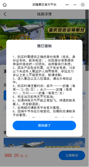 該航線是重慶市首批短途運(yùn)輸航線之一,也是西南地區(qū)唯一的短途運(yùn)輸航線,由華夏航空采用皮拉圖斯PC-12機(jī)型執(zhí)飛,于每周一、三、四、日往返梁平——武隆各一班;于每周六往返永川——武隆一班;于每周二、五往返萬(wàn)州——武隆各一班。旅客可通過微信小程序“武隆景區(qū)官方平臺(tái)”購(gòu)票。