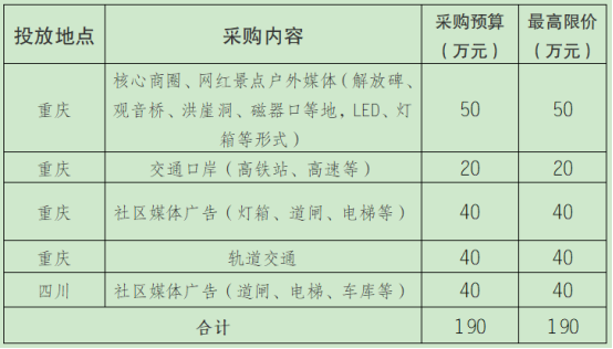武隆景區(qū)擬在川渝兩地采購線下媒體廣告,在核心商圈、網(wǎng)紅景點、社區(qū)等投放,按相關要求進行公開采購比選談判,現(xiàn)誠摯邀請合格服務商報名參加。