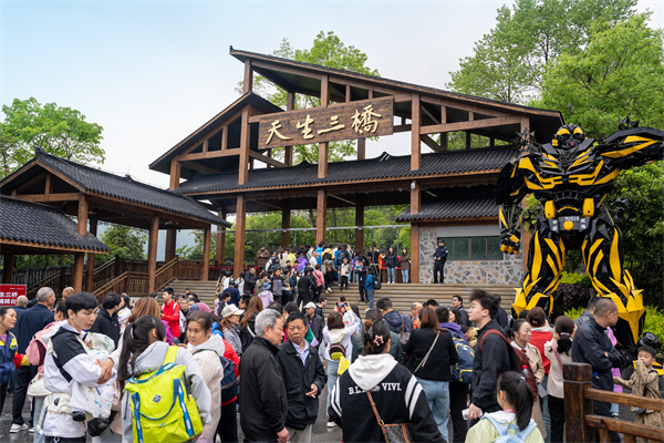一大早,被譽(yù)為“亞洲最大天生石橋群”的天生三橋景區(qū)人頭攢動(dòng),到處都是人山人海,一片熱鬧非凡景象。今年以來(lái),天生三橋景區(qū)創(chuàng)新地推出“仙俠國(guó)風(fēng)趣武隆”、仙女游園、捕快巡游、拋繡球結(jié)緣、變裝打卡武俠世界、古趣投壺、射五毒等文旅趣味活動(dòng),吸引了眾多游客體驗(yàn)打卡,景區(qū)人氣高漲。