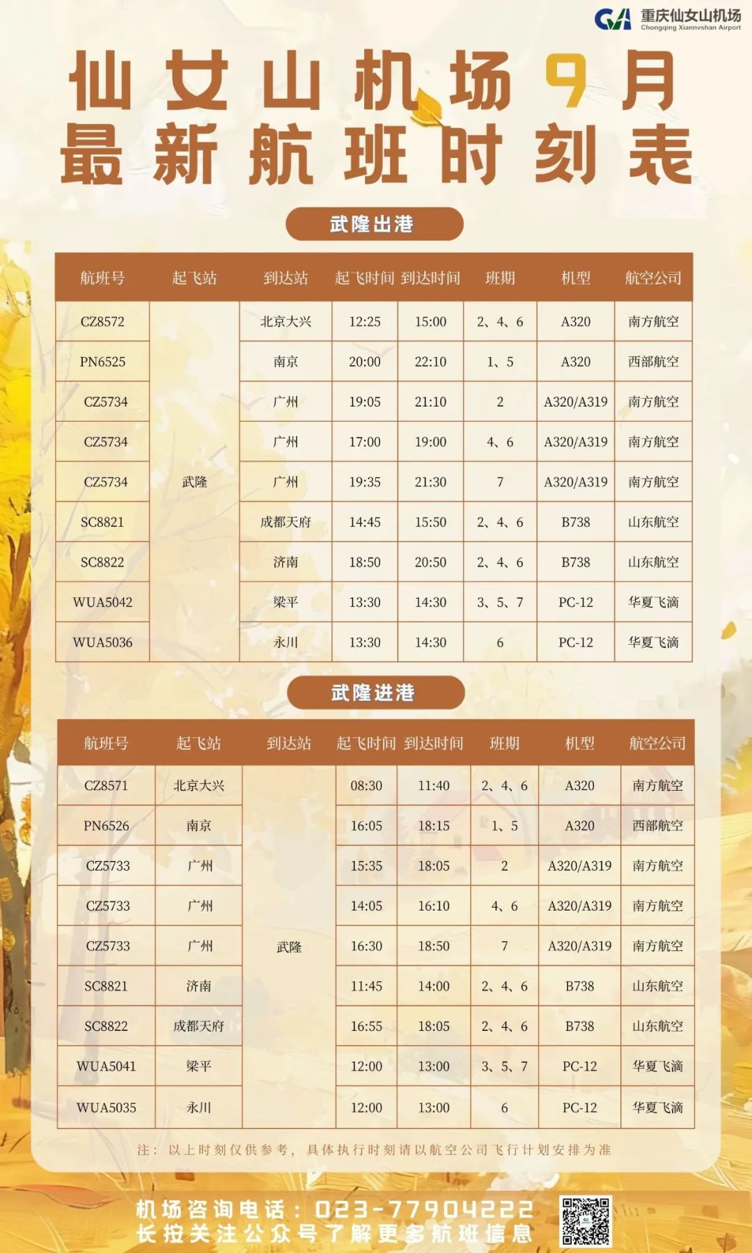 溫馨提示:9月仙女山機場航線將有所調(diào)整,南京=仙女山航線班期調(diào)整為每周一、周五,時刻調(diào)整為南京16:05出發(fā);18:15抵達仙女山,20:00從仙女山出發(fā);22:10抵達南京。