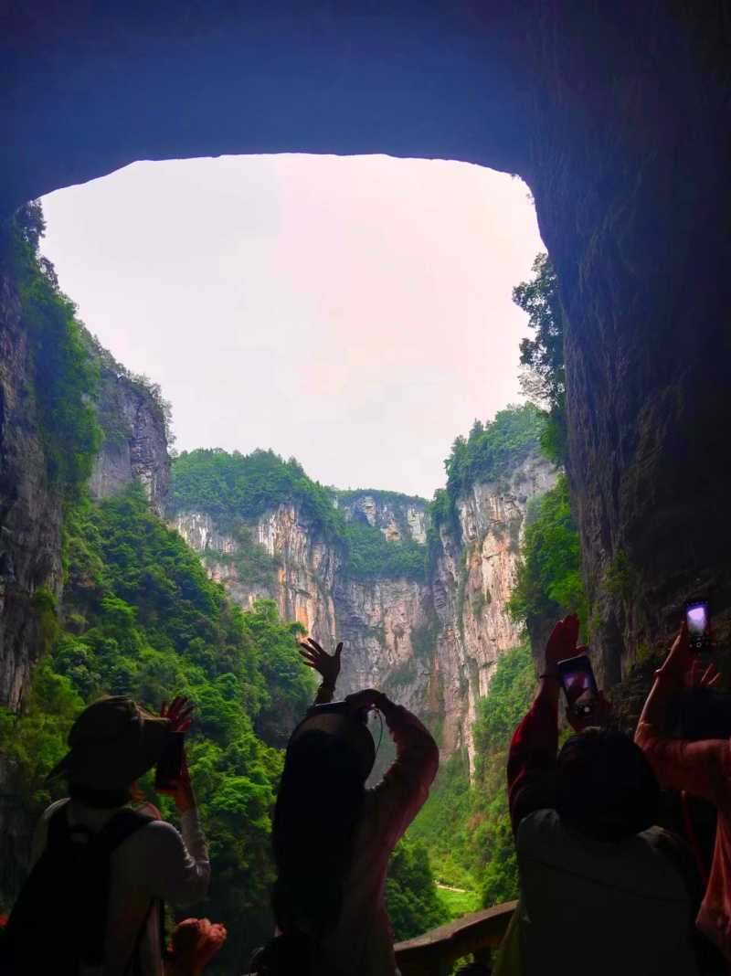 下午,大家來到“亞洲最大天生橋群”天生三橋景區(qū),才剛下電梯,如洞開天門的天龍橋豁然林立,氣勢磅礴的天然石橋,就引得他們紛紛掏出手機(jī)拍照留影,懸崖萬丈,折服于大自然神奇的造物能力,更有游客不顧形象大聲吶喊,一行氣氛十分熱烈。一位來自馬來西亞的王女士表示:“武隆空氣好、風(fēng)景美,第一次見識到武隆這種神奇的地質(zhì)奇觀,感覺大自然鬼斧神工的造物能力好神奇。”