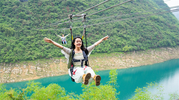 “芙蓉洞內(nèi)五彩斑斕,如夢如幻;乘船感受芙蓉江碧波蕩漾,悠閑愜意”,來自湖北的劉女士表示。“索道、速滑,飛越芙蓉江,驚險刺激,孩子非常喜歡”,來自廣東的李女士表示。游覽奇幻瑰麗的“地下藝術(shù)宮殿”芙蓉洞,“一川游盡畫圖中”的芙蓉江讓游客們感覺非常歡樂,不虛此行。