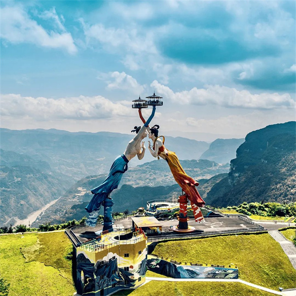 白馬山與仙女山隔江相望,駐足望仙崖可遠眺仙女山奇峰妙筆,繚繞仙姿,感受白龍馬與青衣仙女的絕美愛情,網(wǎng)紅打卡點“飛天之吻”的建造靈感也源于此。國慶假期,許多游客慕名而來,登上“飛天之吻”,縱觀群山逶迤,云海蒼茫;走進8D影院,直觀地感受唯美愛情故事;漫步浪漫仙街,感受色彩斑斕的時尚和浪漫;步入冒險叢林,體驗愛的冒險。
