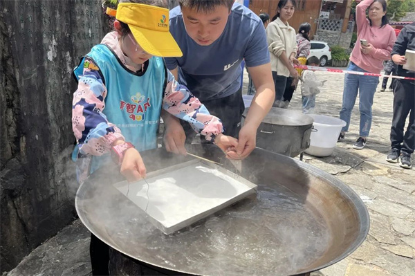 苗寨特色的民俗活動,吸引眾多游客參與。“手工苕粉”“打糍粑”體驗活動將傳統(tǒng)美食制作的魅力展現(xiàn)得淋漓盡致,大家齊心協(xié)力,享受勞動的快樂,“自己動手做的苕粉、糍粑格外香甜”,游客表示。