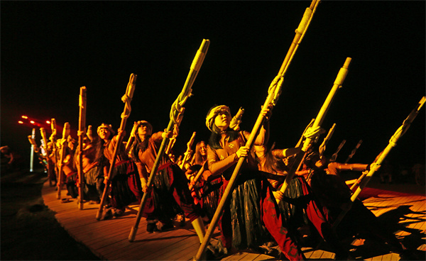 《印象武隆》以國(guó)家級(jí)非物質(zhì)文化遺產(chǎn)“川江號(hào)子”為主題,囊括武隆巴人遺風(fēng)、山水遺情、歷史演進(jìn)的獨(dú)特文化資源,將號(hào)子、哭嫁等傳承千年卻即將消失的民俗形式與棒棒、滑竿、麻辣火鍋等最具重慶特色的人文元素相融合,以真山、真水為舞臺(tái)背景,以當(dāng)?shù)乩习傩丈a(chǎn)生活、民風(fēng)民俗、歷史人文和美麗傳說(shuō)為素材,通過(guò)實(shí)景再現(xiàn)巴渝地區(qū)獨(dú)特的“號(hào)子”文化。