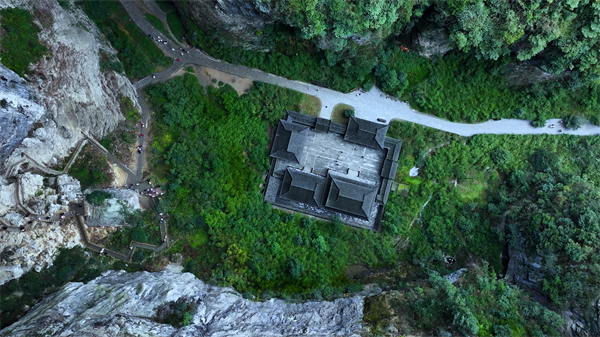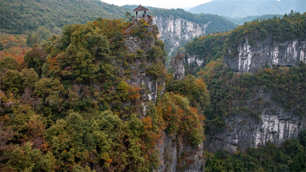 繼續(xù)深入,你會(huì)發(fā)現(xiàn)天生“四橋”的奧秘遠(yuǎn)不止于此。登上那座凌駕于秘境之上的小亭,這里是觀賞天生三橋全景的絕佳位置。在小亭中稍作休息,眺望四周,山風(fēng)徐徐,帶來陣陣涼意,讓人不禁沉醉于這壯麗的景色之中。你不僅可以看到天生三橋的滿目秋色、生機(jī)盎然,還能看到遠(yuǎn)方山巒疊嶂。懸崖峭壁如同刀削斧劈一般,奇峰峻嶺也是千姿百態(tài),一幅幅動(dòng)人心魄的自然畫卷緩緩展現(xiàn)。
