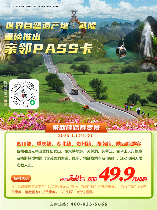 如果你是四川籍、重慶籍、湖北籍、貴州籍、湖南籍、陜西籍的小伙伴,那可太幸運(yùn)啦!2025年4月1日至4月30日,武隆景區(qū)向你們發(fā)出春日邀請(qǐng)函,通過(guò)轉(zhuǎn)發(fā)分享“武隆景區(qū)官方平臺(tái)”小程序產(chǎn)品購(gòu)買(mǎi)頁(yè)面,只要49.9元,就能擁有一張價(jià)值540元的親鄰Pass套票!這張?zhí)灼卑讼膳健埶畭{地縫、芙蓉洞、芙蓉江、白馬山天尺情緣景區(qū)以及喀斯特博物館,連芙蓉洞索道、芙蓉江纜車(chē)、龍水峽地縫換乘車(chē)及電梯都涵蓋在內(nèi),并且活動(dòng)期間憑本人身份證可以無(wú)限次數(shù)入園。