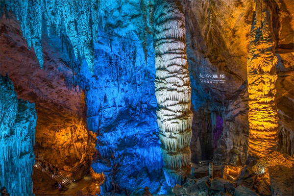 走進(jìn)芙蓉洞,就仿佛踏入了一個神秘的地下世界。五彩斑斕的燈光照亮了洞內(nèi)形態(tài)各異的石筍、石柱、石瀑布。而其中讓人驚訝的,便是那兩根宛如西安大小雁塔的石筍。它們靜靜地矗立在洞中,中間還蹲著一只形態(tài)逼真的小石獅,不事雕鑿,卻栩栩如生,讓人不得不感嘆大自然的神奇創(chuàng)造力。據(jù)推測,這兩根石筍在芙蓉洞大崩塌前就已經(jīng)形成,距今已有幾十萬年的高齡 ,歷經(jīng)歲月的洗禮,依然保存完好。