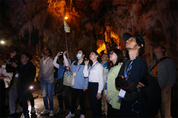 除了這對神奇的“大小雁塔”石筍,芙蓉洞還有眾多獨(dú)特的景觀。如“巨幕飛瀑”,氣勢磅礴,仿佛是從天際奔騰而下的銀河;“珊瑚瑤池”“犬牙晶花池”等池水沉積景觀,池水清澈透底,沁人心脾,水池周邊滿布的方解石晶花微黃且剔透;,讓人不禁感嘆大自然這位雕塑家的鬼斧神工。