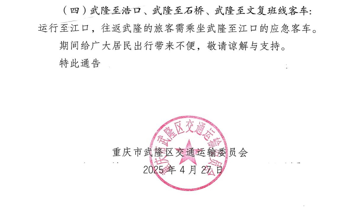 此外,為方便大家出行,武隆城區(qū)?江口鎮(zhèn)(芙蓉洞、芙蓉江)應急客運班線已開通,途徑城區(qū)江北、渝湘高速復線(鳳山收費站·武隆南)、G319(大巖洞)至江口(芙蓉洞、芙蓉江景區(qū))。