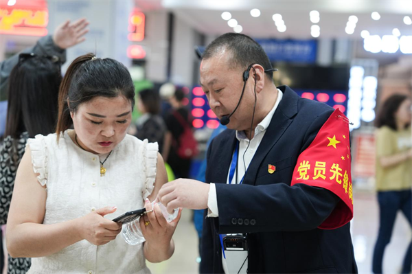 工作人員協(xié)助游客現(xiàn)場(chǎng)網(wǎng)上買票