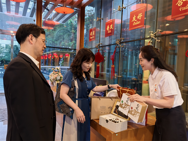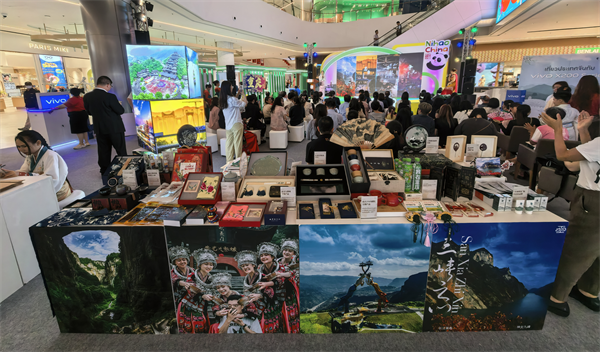 “旅游展臺(tái)”現(xiàn)場鋪設(shè)泰文、英文雙語宣傳冊及精裝畫冊,詳細(xì)介紹“重慶+武隆”精華線路產(chǎn)品,將“8D魔幻之城”重慶與“世界自然遺產(chǎn)地”武隆完美串聯(lián),勾勒出其獨(dú)特魅力。“非遺展臺(tái)”文創(chuàng)區(qū)則以冰箱貼、折扇等“武隆元素”衍生品傳遞山城詩意,浩口蠟染以靛藍(lán)扎染演繹“山水入布”,仙女紅氤氳著云霧深處的茶香,武隆非遺柴燒制藝讓非遺之美成為可以攜帶的旅行記憶。