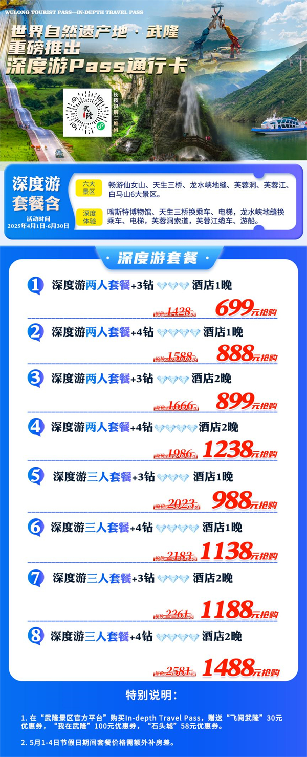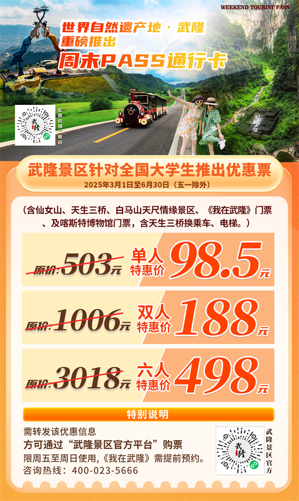 端午佳節(jié),門票福利少不了!低至1.1折的初夏Pass,單人、雙人、六人行的大學(xué)生周末Pass,更有六大景區(qū)+3鉆、4鉆酒店的深度游Pass任你選擇,還有特殊人群Pass以及驚喜優(yōu)惠券,1卡玩轉(zhuǎn)武隆景區(qū),性價比簡直拉滿!