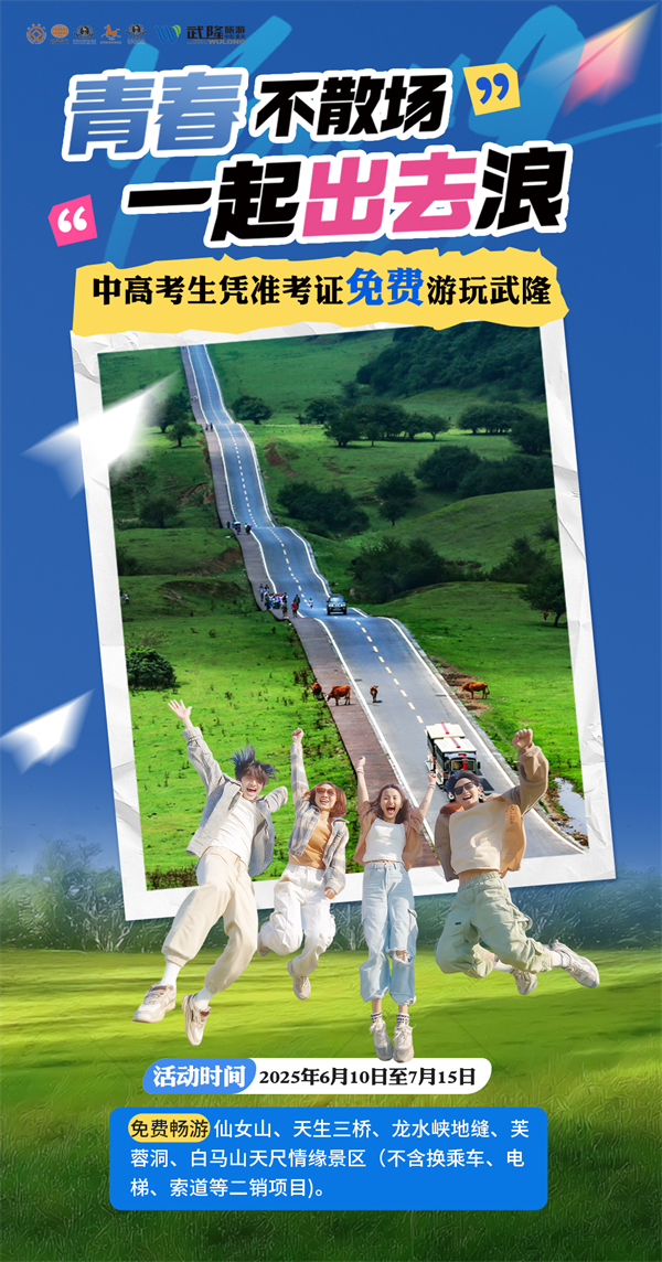 重點(diǎn)來啦!2025年6月10日至7月15日期間,只要你手持本人有效身份證件和中 / 高考準(zhǔn)考證,就能免武隆五大核心景區(qū)門票!沒錯(cuò),仙女山、天生三橋、龍水峽地縫、芙蓉洞、白馬山天尺情緣景區(qū),統(tǒng)統(tǒng)免費(fèi)進(jìn)!(不含換乘車、電梯、索道等景區(qū)二銷項(xiàng)目)讓你可以毫無負(fù)擔(dān)地暢游美景用最少的花費(fèi),收獲最難忘的青春回憶。