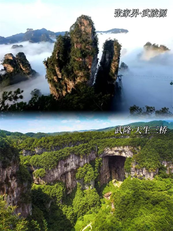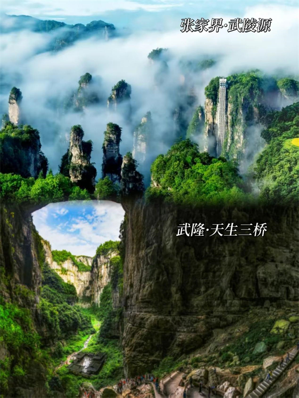 同屬于世界自然遺產(chǎn)地,張家界與武隆都是喀斯特地貌的杰出代表,峰林、峽谷、天坑、溶洞等景觀一應俱全。武陵源的奇峰怪石與武隆天生三橋的雄偉石拱,都展示了喀斯特地貌的神奇創(chuàng)造力。
